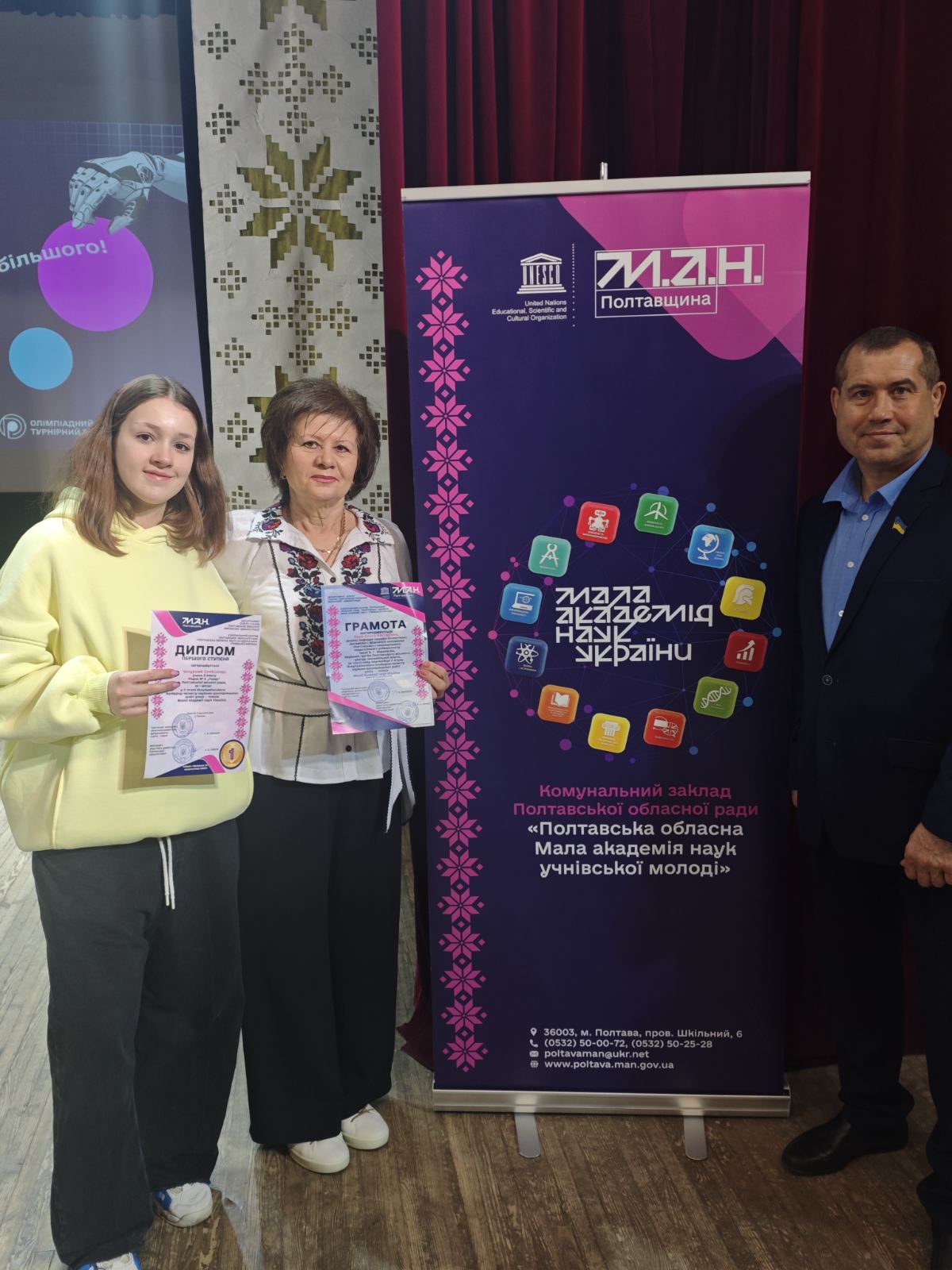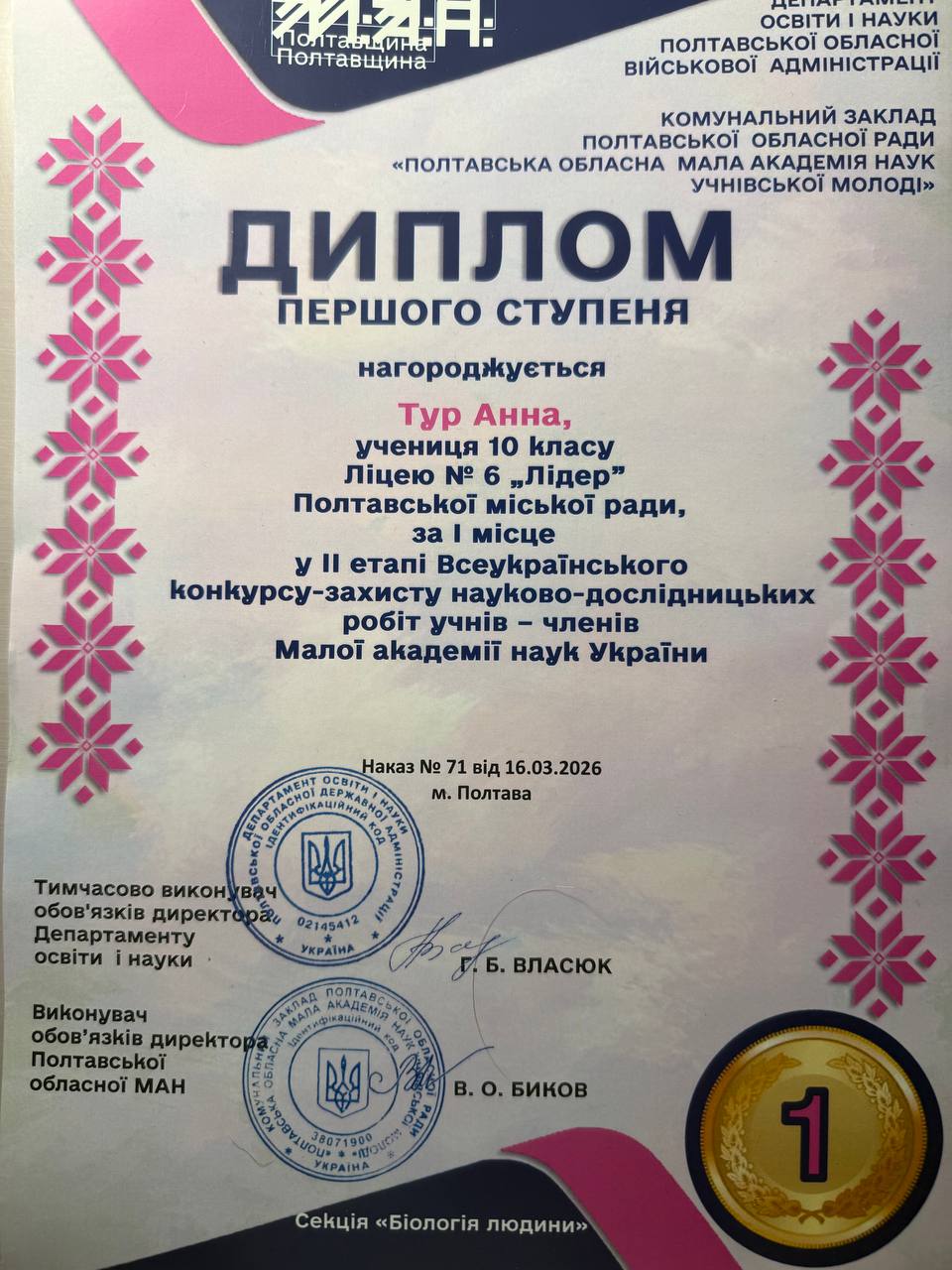 Колектив кафедри висловлює щирі вітання юним науковцям Тур Анні учениці 10-М класу ліцею №6 «Лідер» вихованці гуртка «Основи біології», яка посіла І місце та Ротар Катерині учениці 11-М класу ліцею №6 «Лідер» вихованці гуртка «Біологічні дослідження», яка посіла ІІІ місце та їхнім керівникам Квак О.В. і Денисовець Т.М. Пишаємося високими результатами наших вихованців і продовжуємо працювати над створенням сприятливого середовища для розвитку інтелектуальної еліти України, зміцнюючи традиції наукового наставництва та міжгалузевої співпраці.