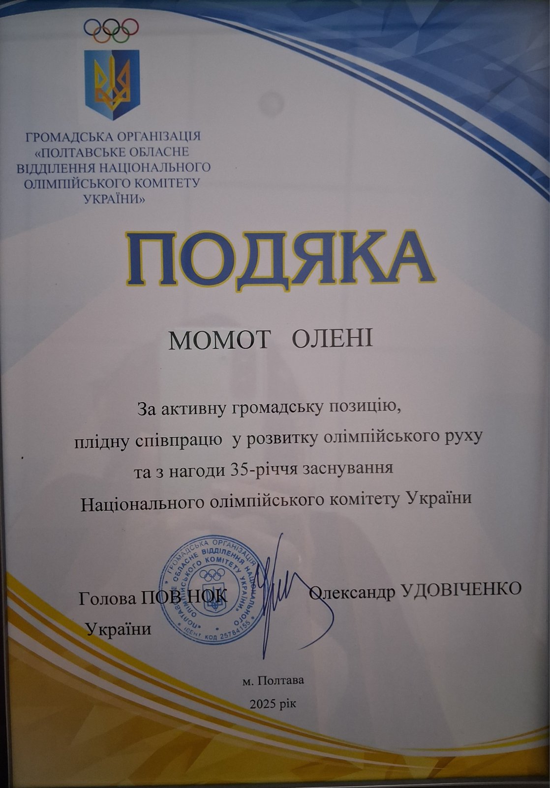 Професорка Олена Момот отримала відзнаку від Полтавського обласного відділення НОК України
