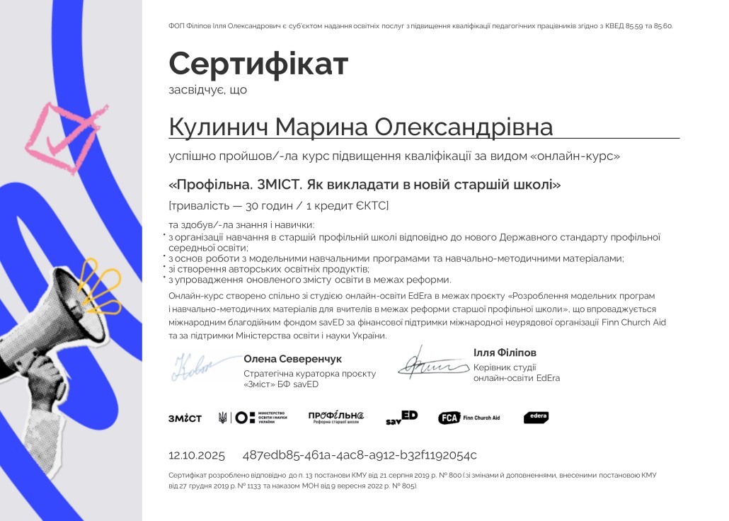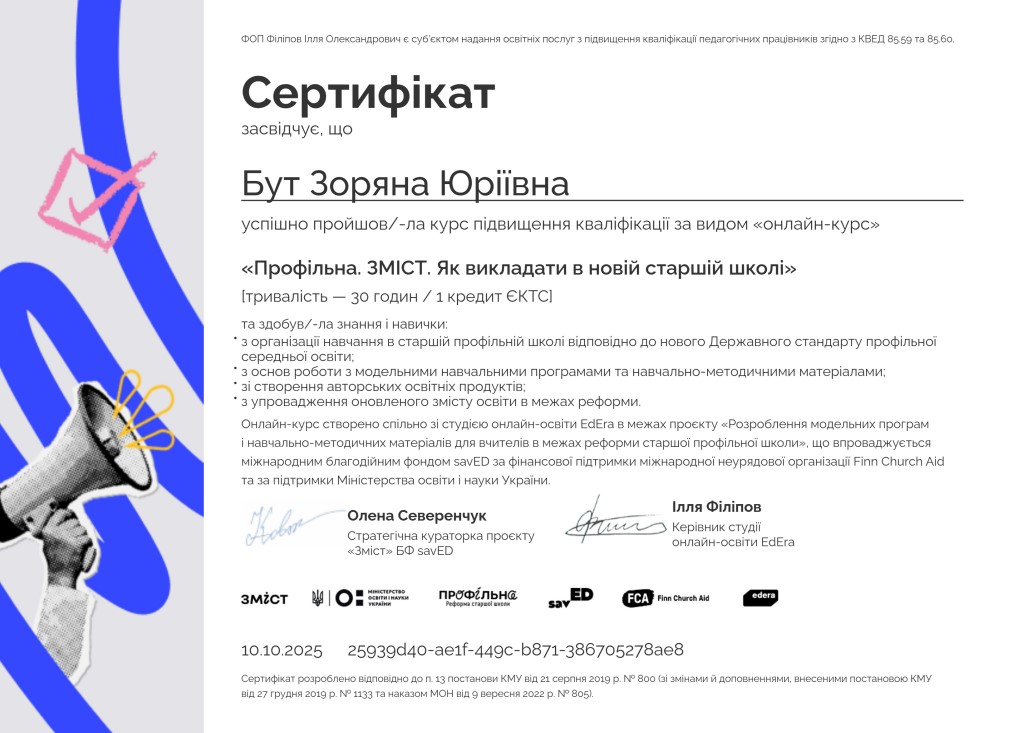 Курс розроблено студією онлайн-освіти EdEra у межах проєкту «Розроблення модельних програм і навчально-методичних матеріалів у межах реформи старшої профільної школи», що реалізується міжнародним благодійним фондом savED за підтримки Міністерства освіти і науки України та міжнародної організації FinnChurch Aid (FCA).