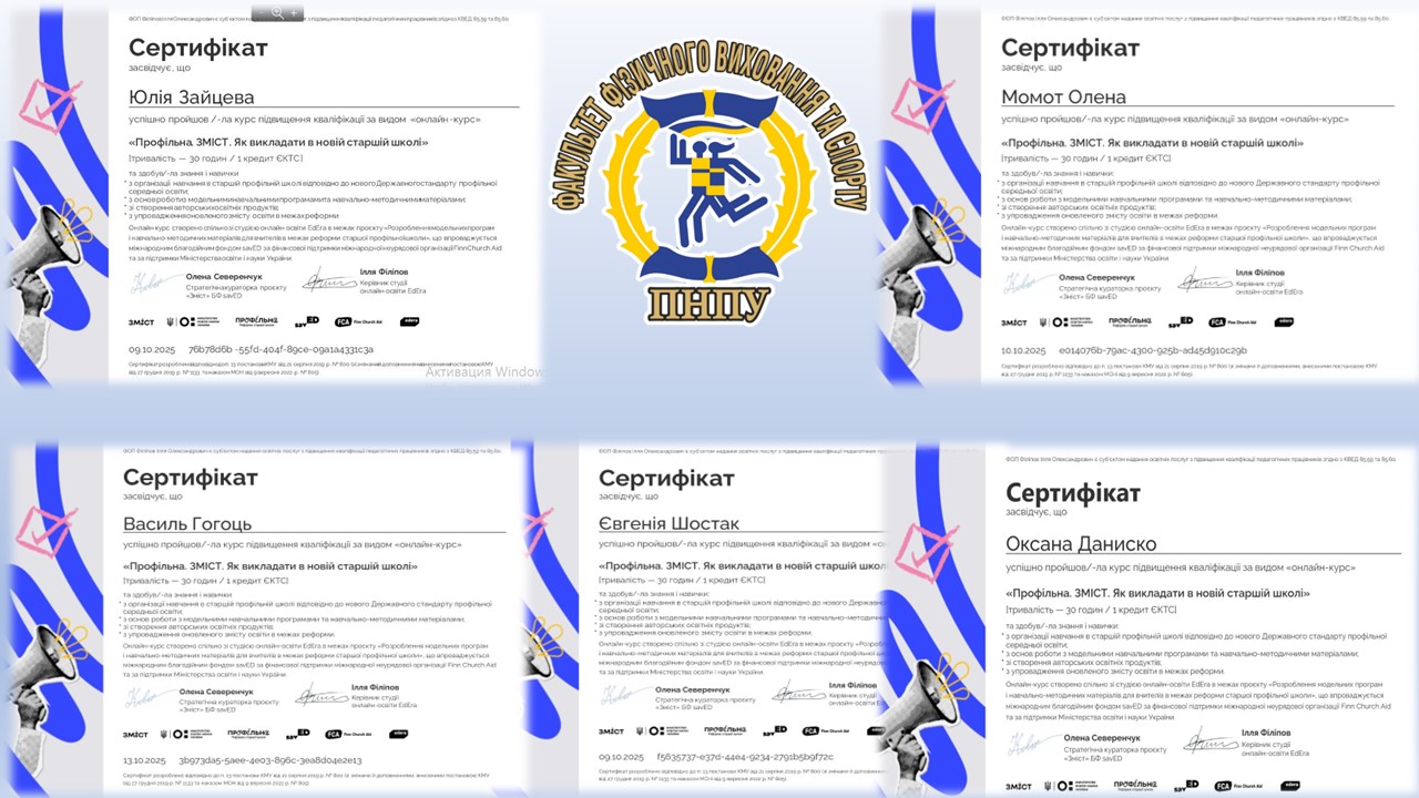 Викладачі та студенти факультету фізичного виховання та спорту успішно пройшли онлайн-курс підвищення кваліфікації «Профільна. ЗМІСТ. Як викладати в новій старшій школі» тривалістю 30 годин (1 кредит ЄКТС). Онлайн-курс складається з 6 модулів, 15 відеоуроків, 6 проміжних тестів, фінального іспиту та додаткових матеріалів.  Під час навчання освітяни здобули нові знання й навички з організації освітнього процесу в старшій профільній школі, ознайомилися з сучасними навчально-методичними матеріалами.